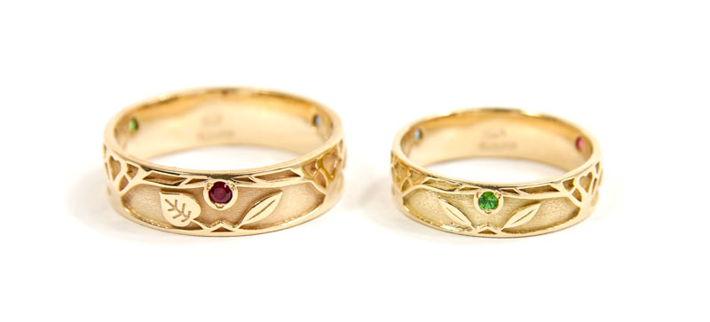 Các cặp đôi có thể chọn hoa văn là hình chiếc lá, cánh hoa, cỏ bốn lá hay hai trái tim lồng ghép vào nhau làm cho đôi nhẫn thêm ấn tượng, độc đáo; những cặp đôi thích phá cách thì chọn các họa tiết như hình khối, tứ giác hay hình mê cung thể hiện sự mạnh mẽ.